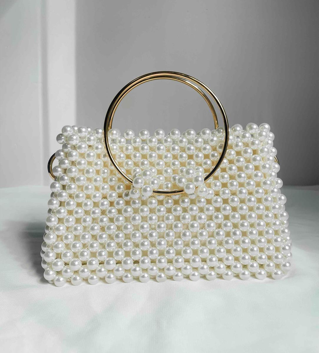 Bolsa confeccionada a mão com pérolas.