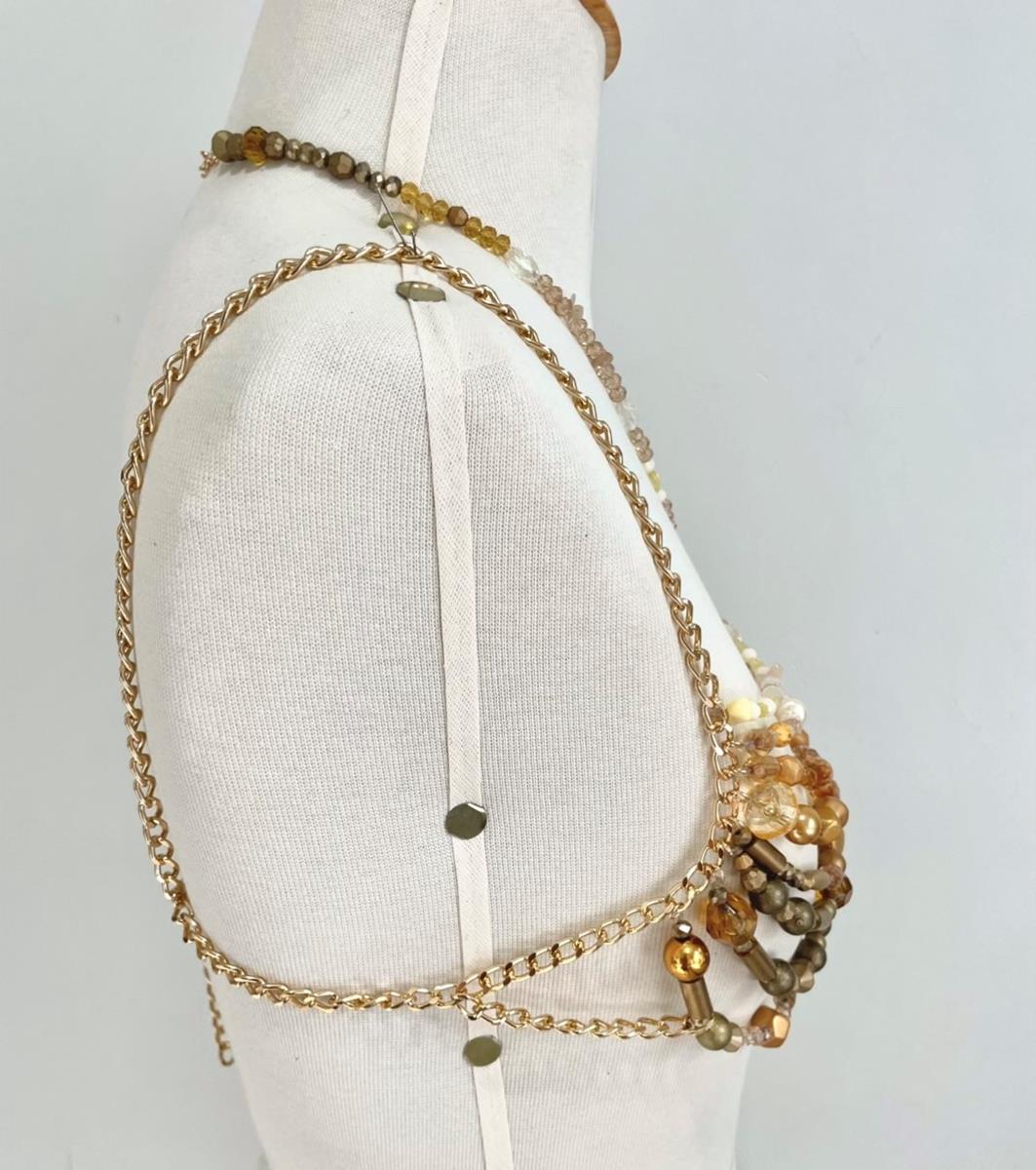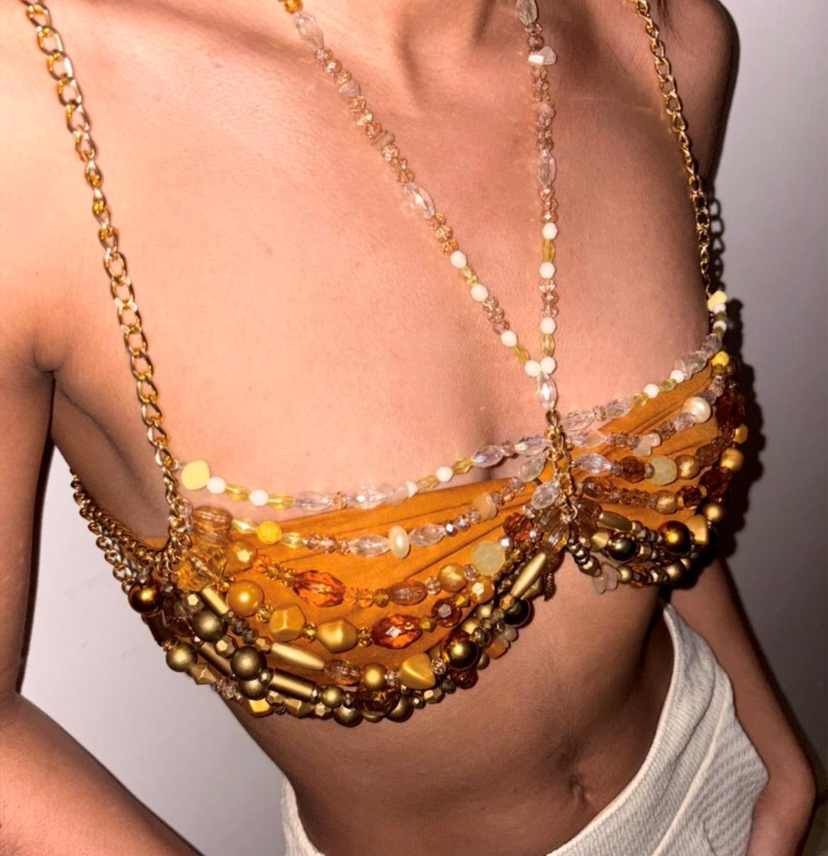 Top Sunny é como um dia ensolarado, movimento e brilho. Confeccionado manualmente com pedrarias selecionadas uma a uma, revelando camadas de luz e e texturas.