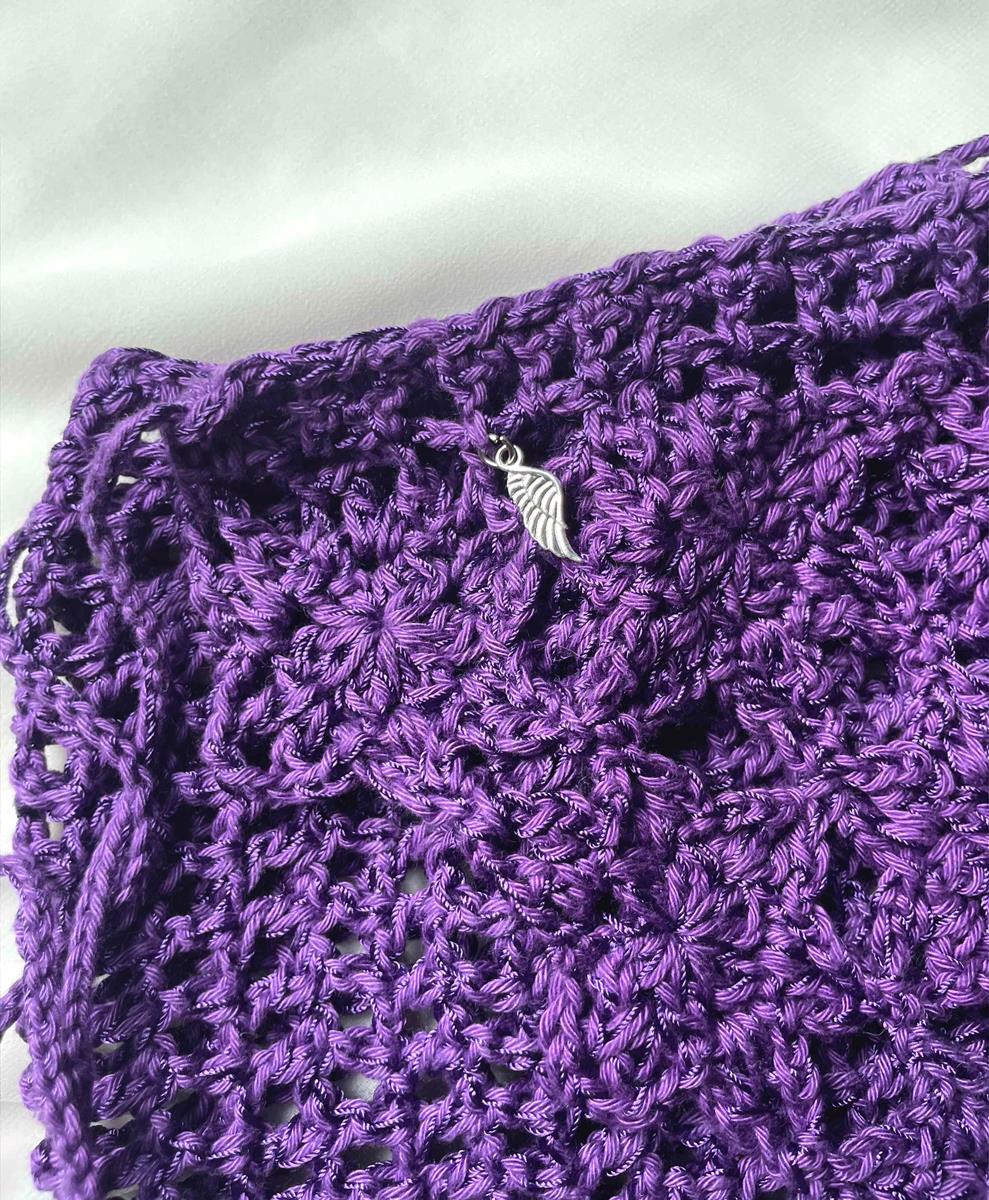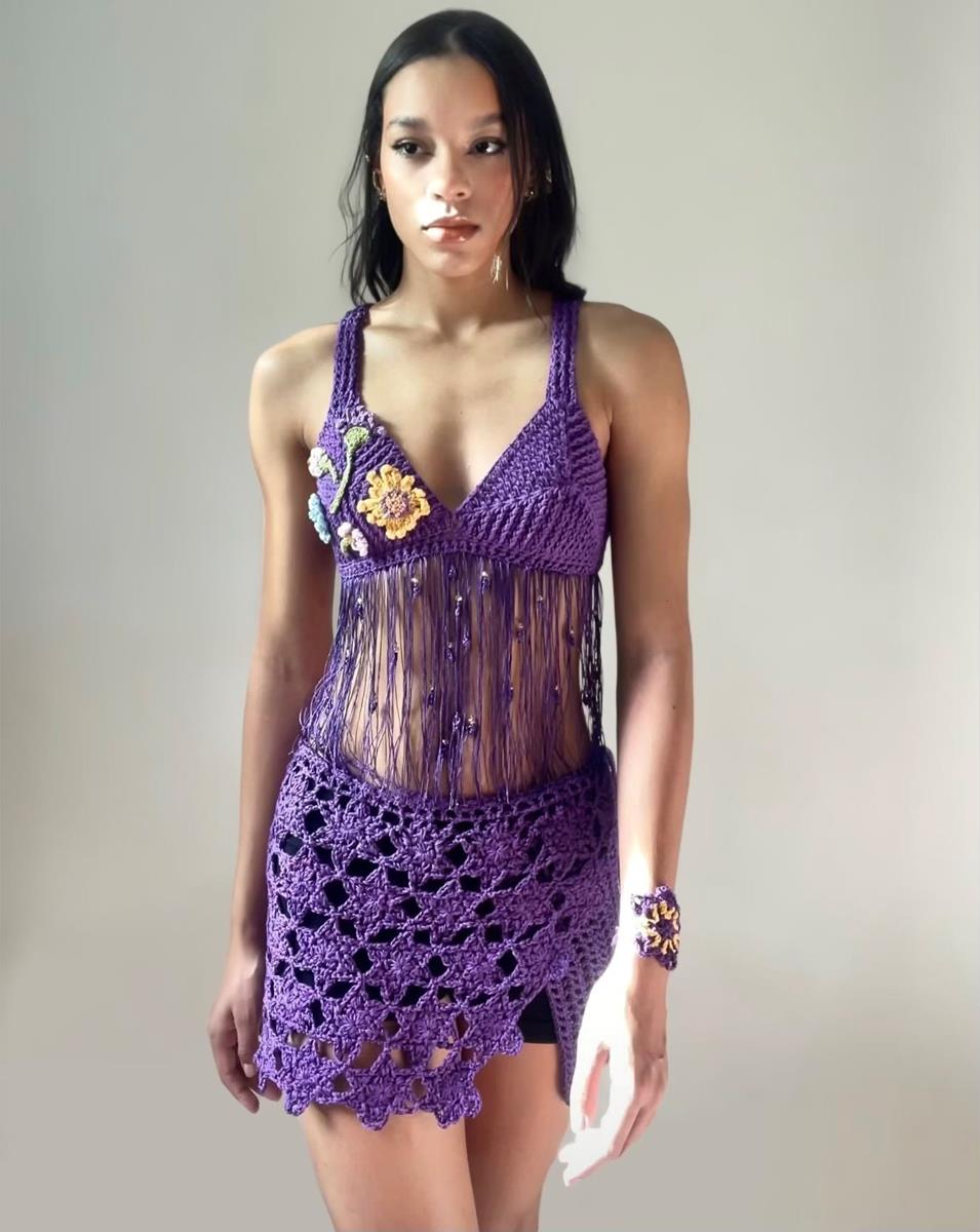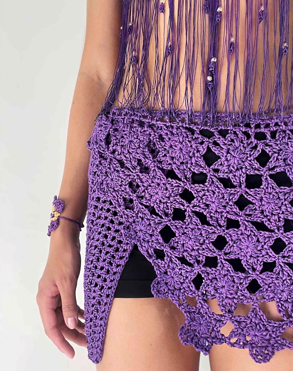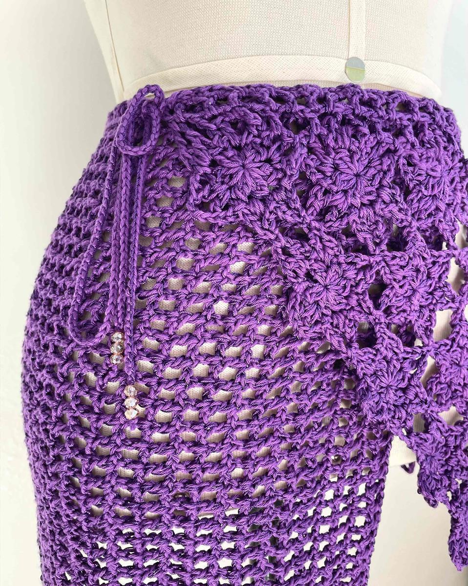 Saia confeccionada em crochê, composição de fio de algodão e fio cordonê.